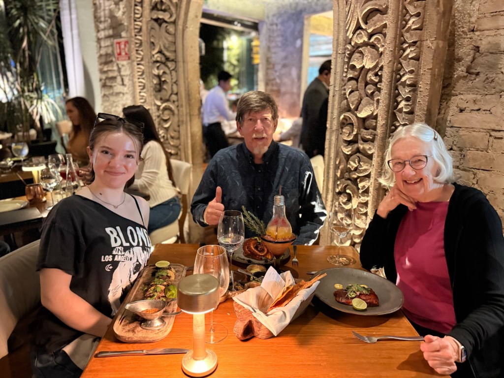 Duke and I are on a short one week trip to Mexico City with our Granddaughter. We flew in yesterday. We are staying in a very nice apartment called Capitalia Obelisk Polanco. When we got here we took a short break and then had a great dinner at about ten o’clock at the restaurant Agua and Sol.