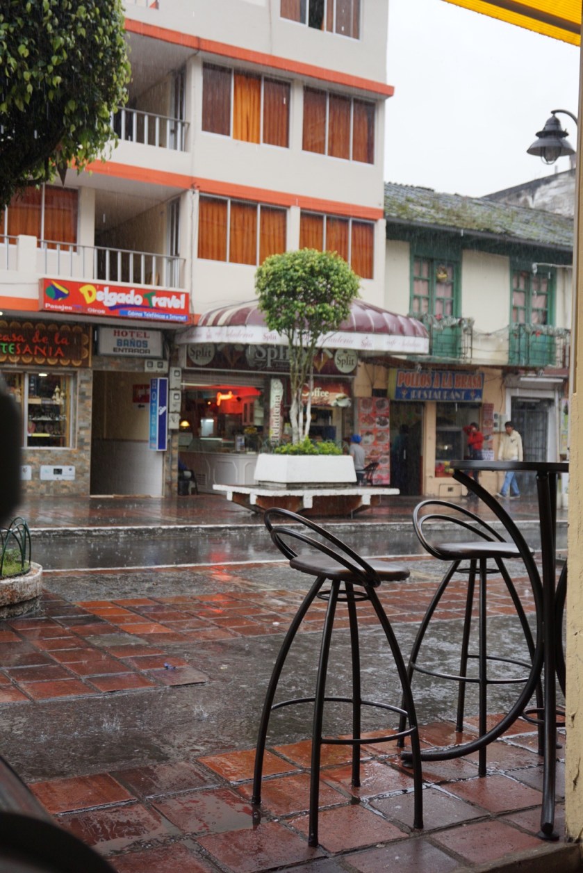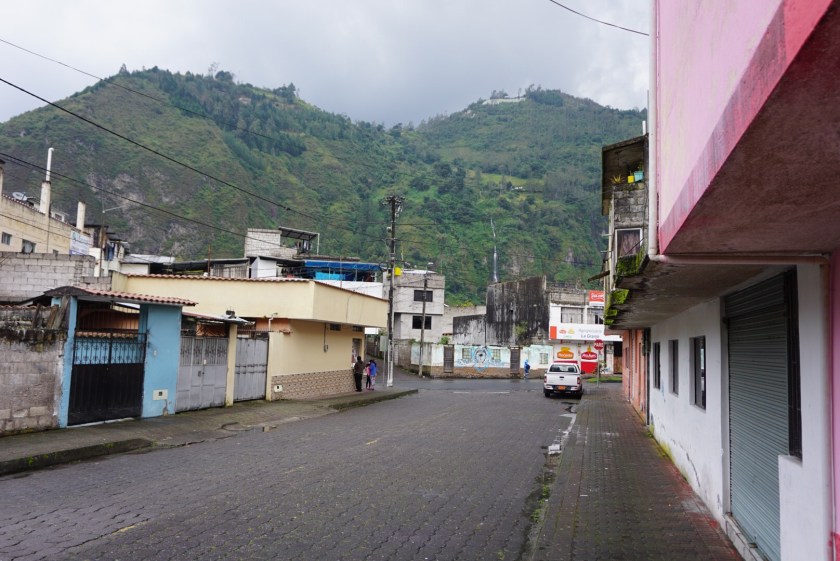 We explored Baños a bit in the rain. Baños is a small town surrounded by towering mountains. In the picture below which is taken right outside our accommodations you can just see a waterfall.
