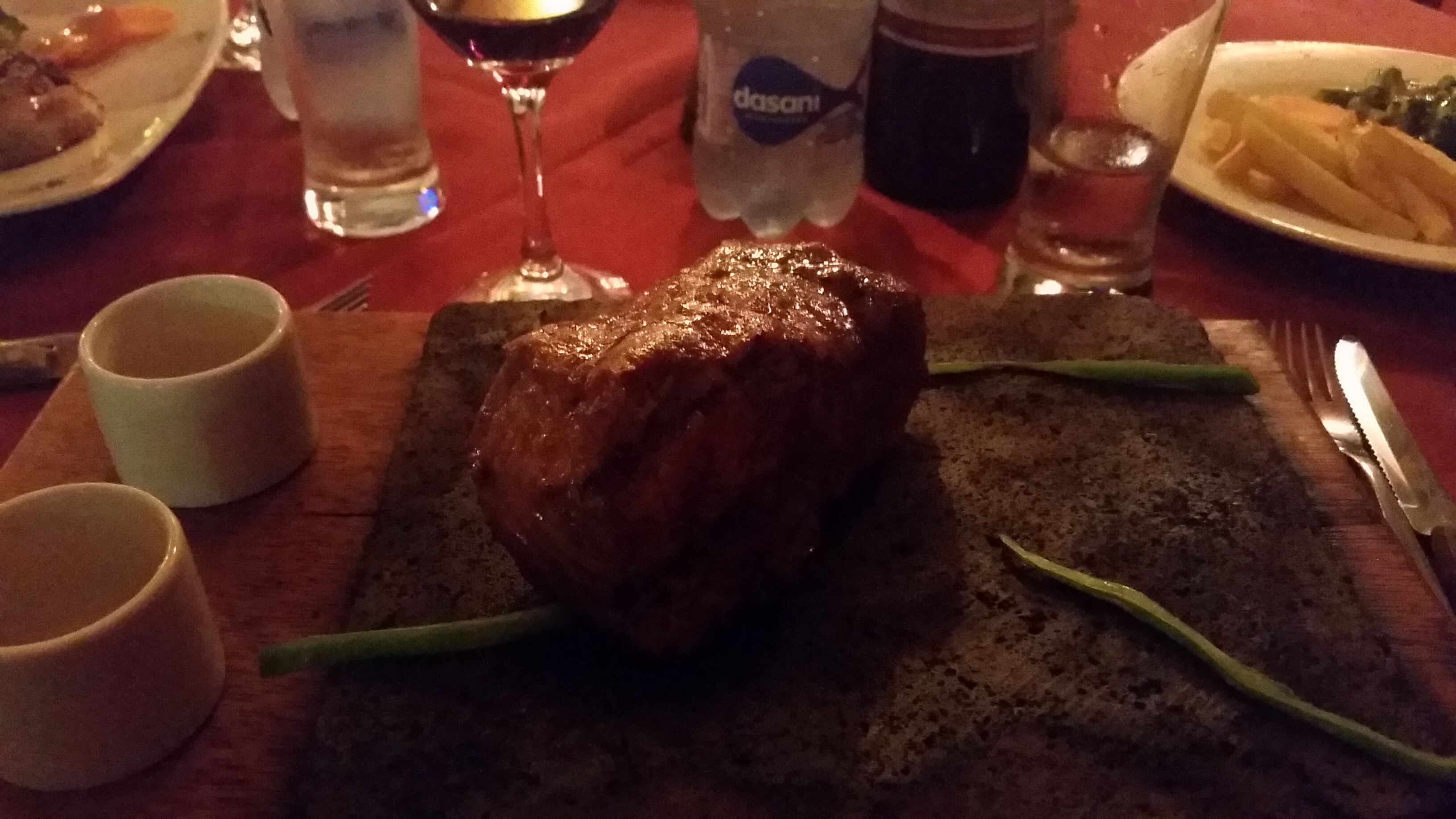 We went to a steak restaurant for dinner. Duke had meat on the stone.