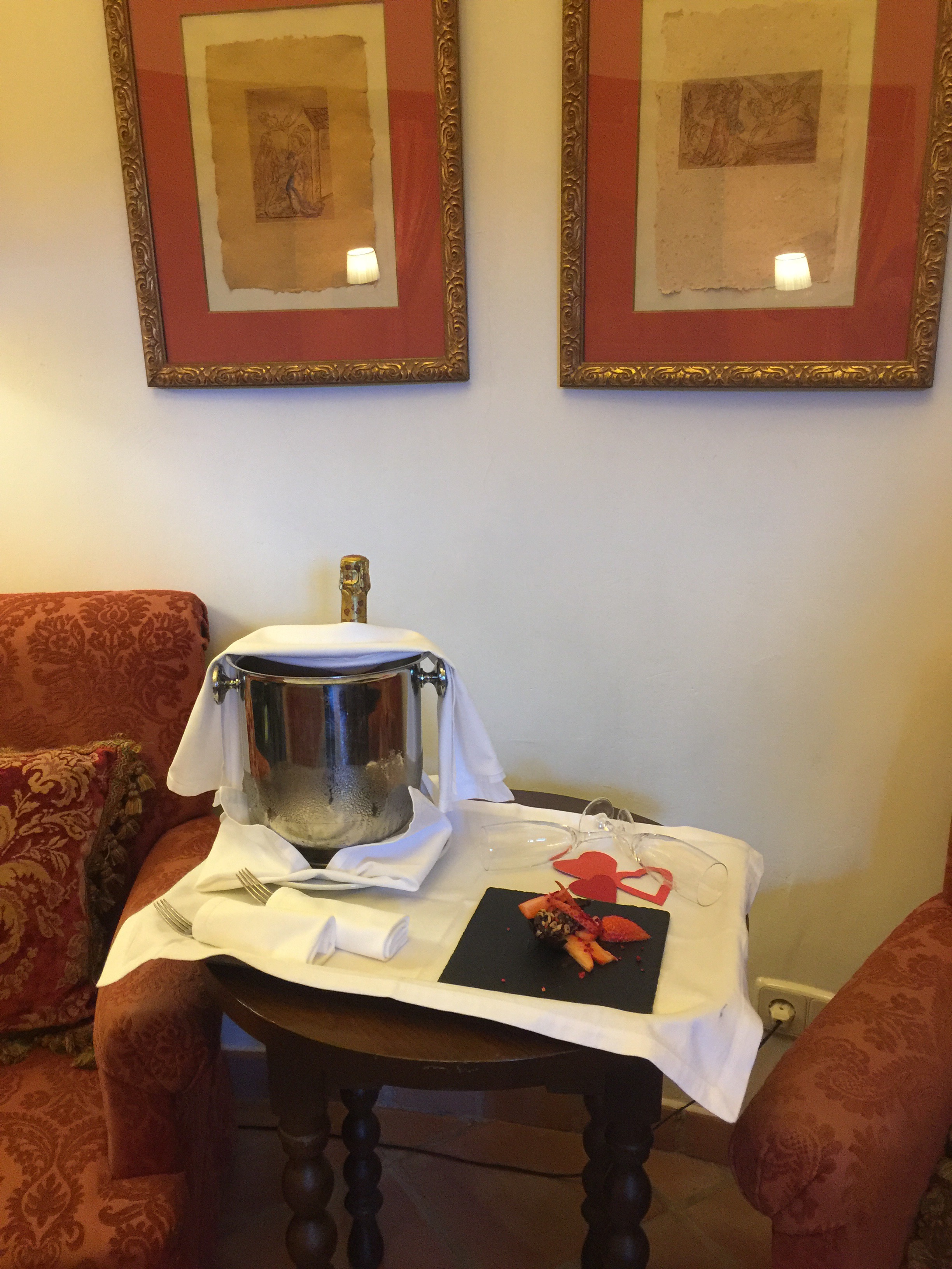 As part of the romantic package which we have here we get a bottle of wine and a ham appetiser. We also get champagne and chocolates.  A big problem was deciding which one to drink. We decided to save the champagne for another day.
