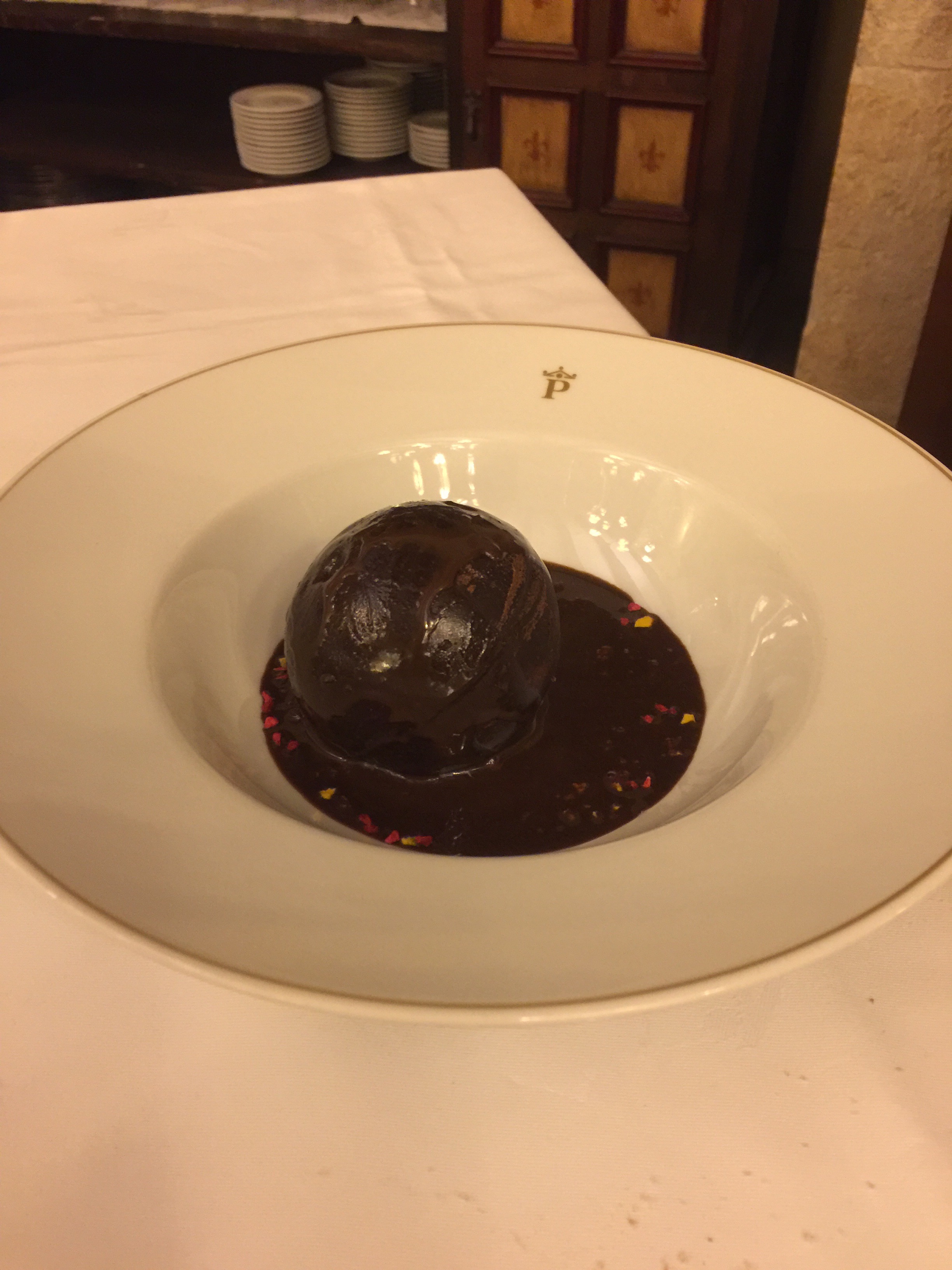 Dinner was great although none of my pictures really do it justice. This desert was a chocolate ball filled with cake and candy. Our waitress poured hot chocoltae over it at the table.