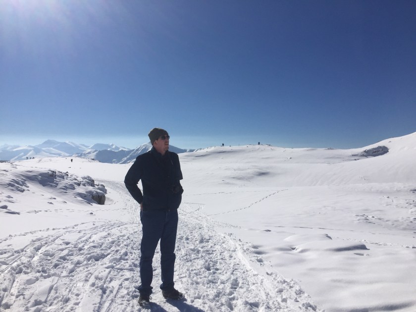 We took the cable car up the mountain, enjoyed the views and walked around in the fresh snow. The cable car goes up almost 2,500 feet. As you can see the views are fantastic. In our cable car there was a family with a sled. We saw a few families sledding with kids chortling with joy.