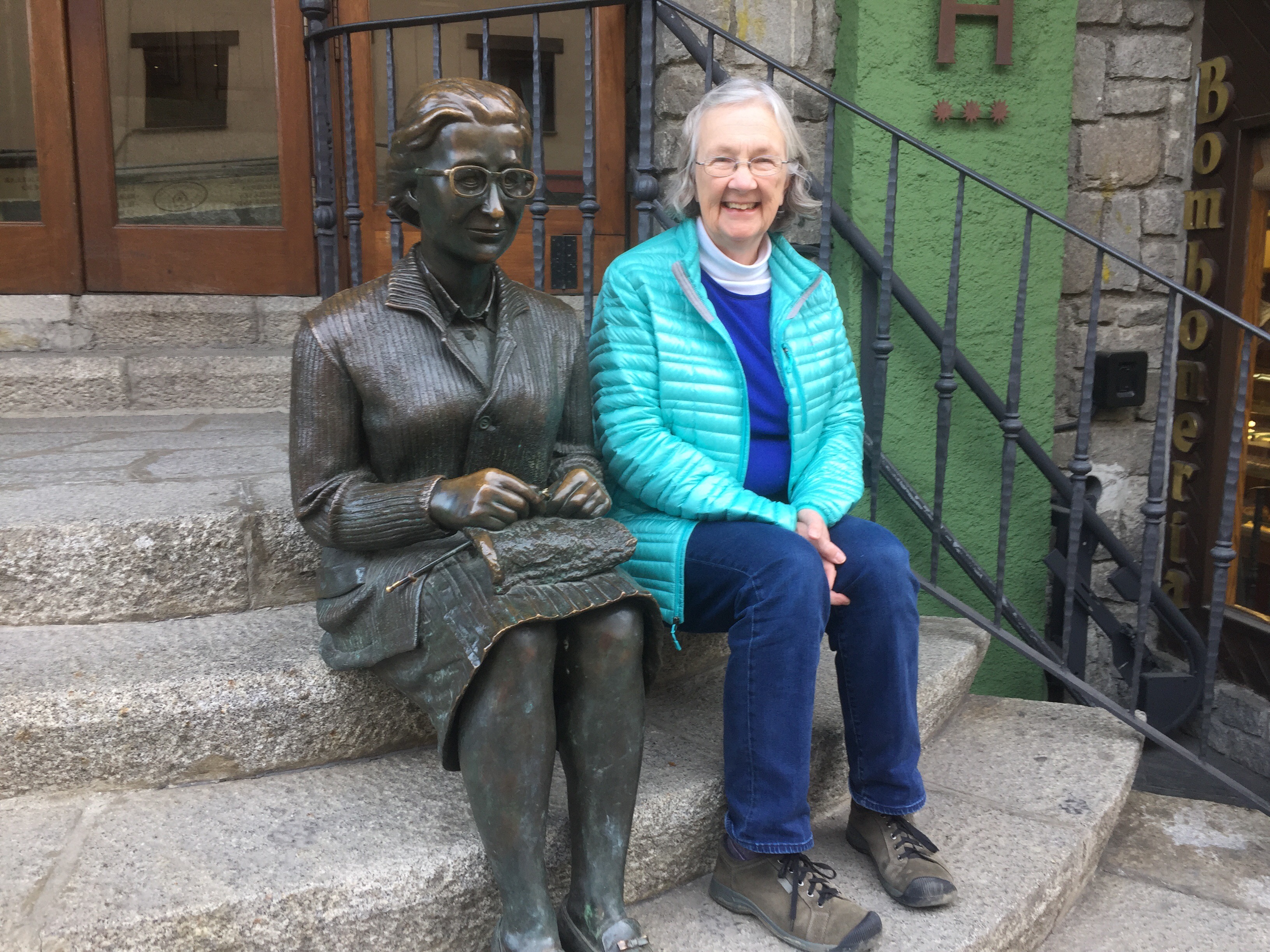 The statue you’re sitting next to made me smile. But where’s your knitting?