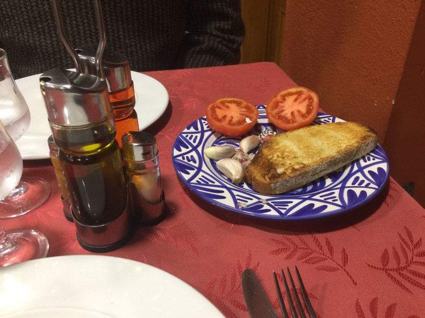 We are dinner here at the inn. They started our meal with toast. They explained that we should rub garlic on the toasted bread, then rub tomatoes on the toast. Finally we should drizzle on olive oil and add salt. It was yummy as was the whole meal.