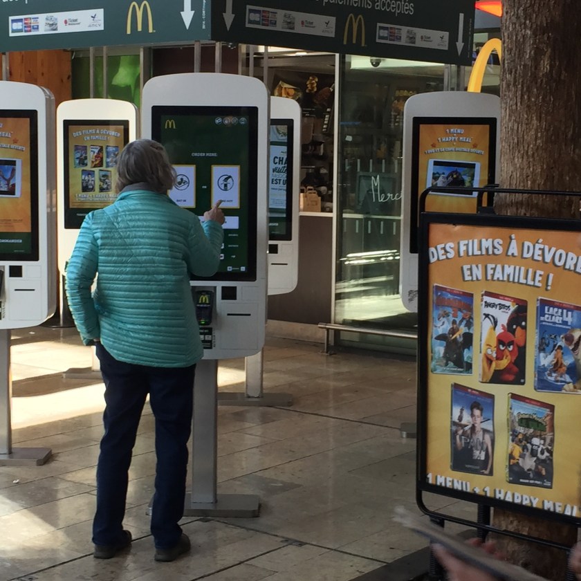 Duke’s 65th Birthday!!! It seems entirely appropriate that we spend it traveling! This morning we took a train to Marseille. I think it is interesting that McDonald’s in the Marseille train screen has touch screens where you can order and pay .