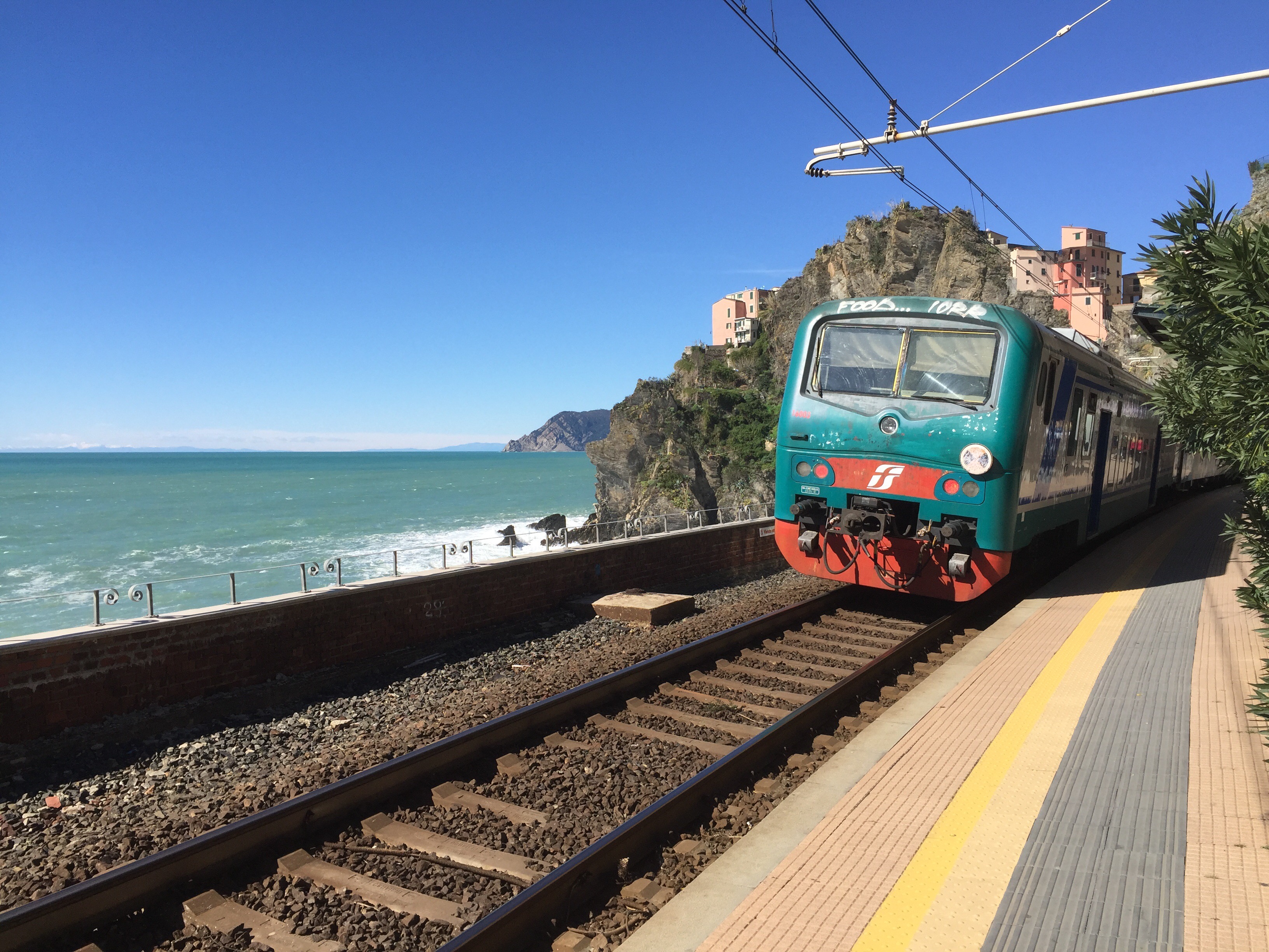 When we were planning our trip Allison highly recommended that we visit Cinque Terre. So that’s where our travels took us today. It is stunningly beautiful. Cinque Terre is a string of five villages on the cliffs of the Mediterranean. You can hike between them or take a train that connects the town via tunnels through the cliffs. Here you can see our train leaving the station. We are staying in Manarola.