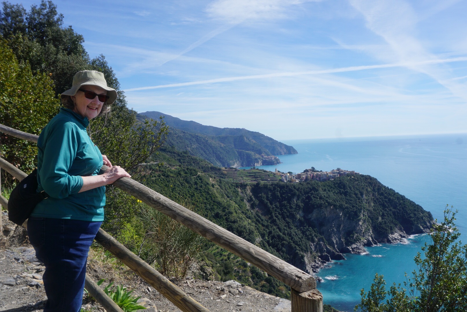 Today we took the train to Corniglia the middle of the five Cinque Terre towns and hiked north from there to Vernazza. The route still had ups and downs but it was more along the coast than our other two hikes. In the picture below you can just see Corniglia and behind it on the next point Manarola where we are staying.