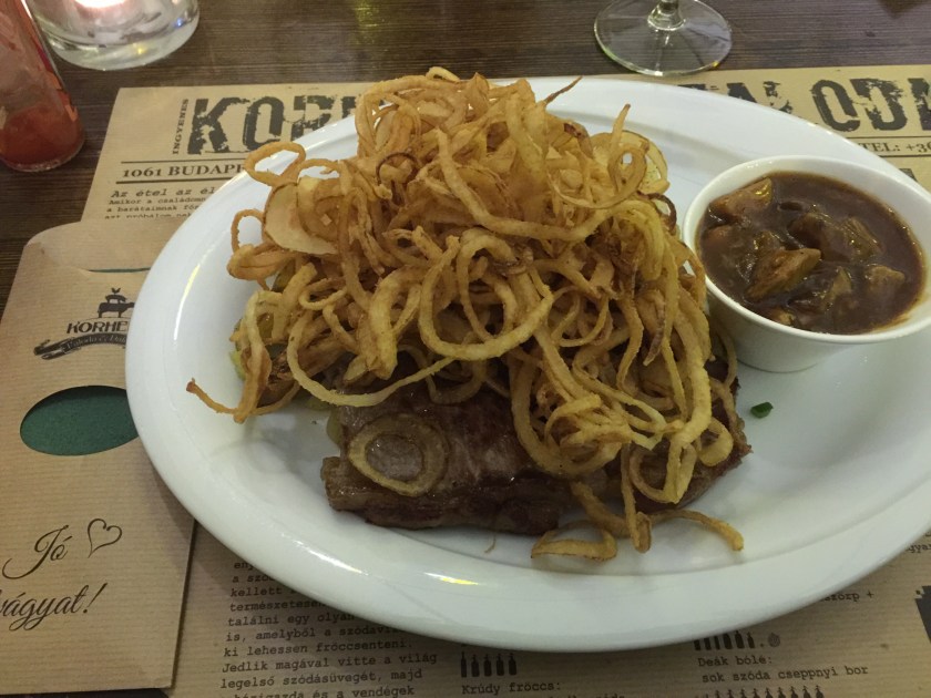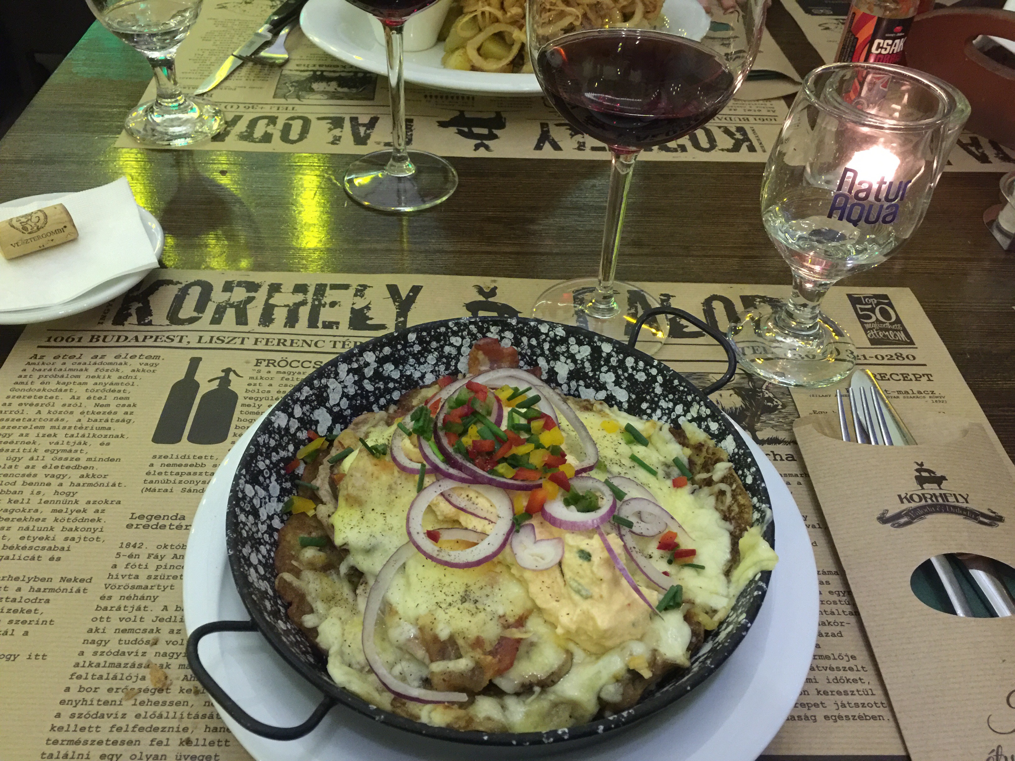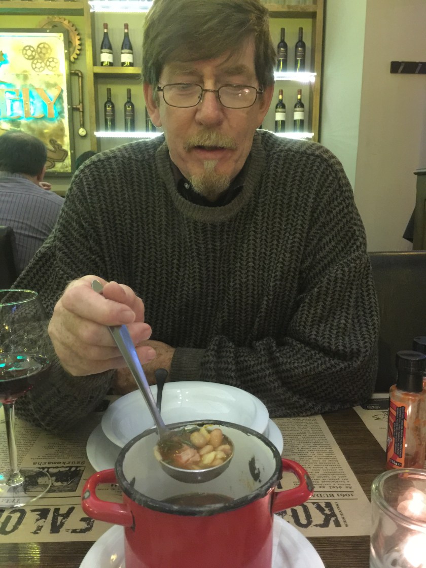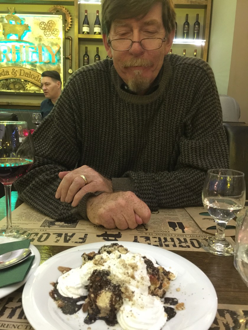 Tonight for dinner we found a very nice Hungarian restaurant. We started with bean goulash. Then Duke had steak and I had pork tenderloin. We finished with  a traditional cake desert.