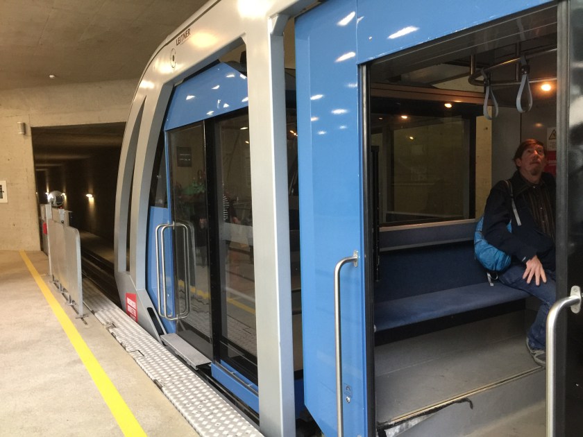 From the city center we took the cable railroad up the mountain to Hungerburg. It starts out as a subway then becomes a funicular. Each car swivels independently. As we were going up the bottom of our car was about even with the top of the car below us.