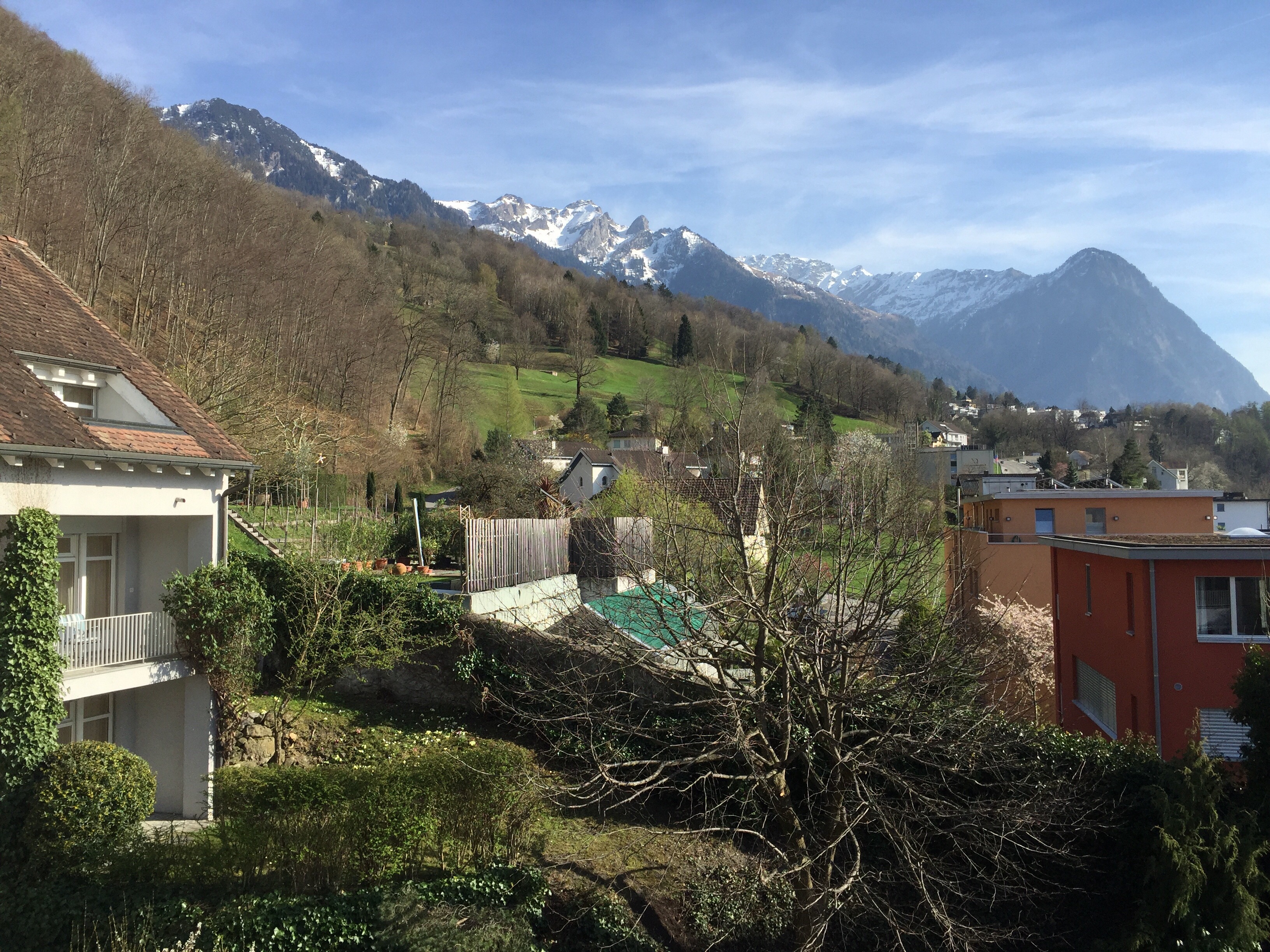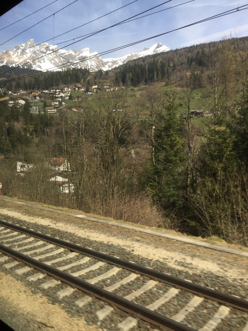 Then we walked to the train station and caught a train to Feldkirch near the Austria Lichtenstein border. The train route took us through an idyllic picturesque countryside of green fields, villages and snow capped mountains.