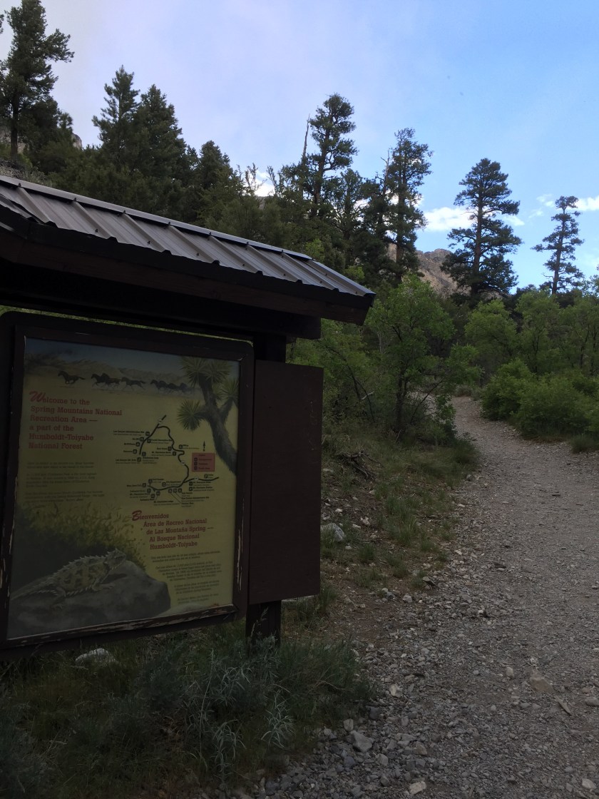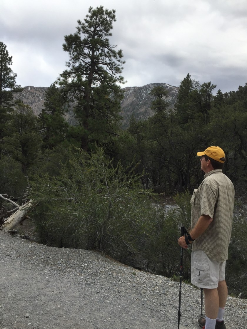 We decided that we would try to hike on most days of this trip. I spent some time during the last few weeks picking a hike for each day of the trip. I wasn’t sure we would be able to do the planned hike today. The temperature high for Las Vegas was predicted to be 102. When we turned off the highway towards the trailhead it was 99 but by the time we got to the trailhead up in the mountains it was 75, perfect hiking weather! We hiked the Fletcher Canyon Trail in the Spring Mountains. It was a great hike. 3.2 miles was perfect after sitting in the car all day.