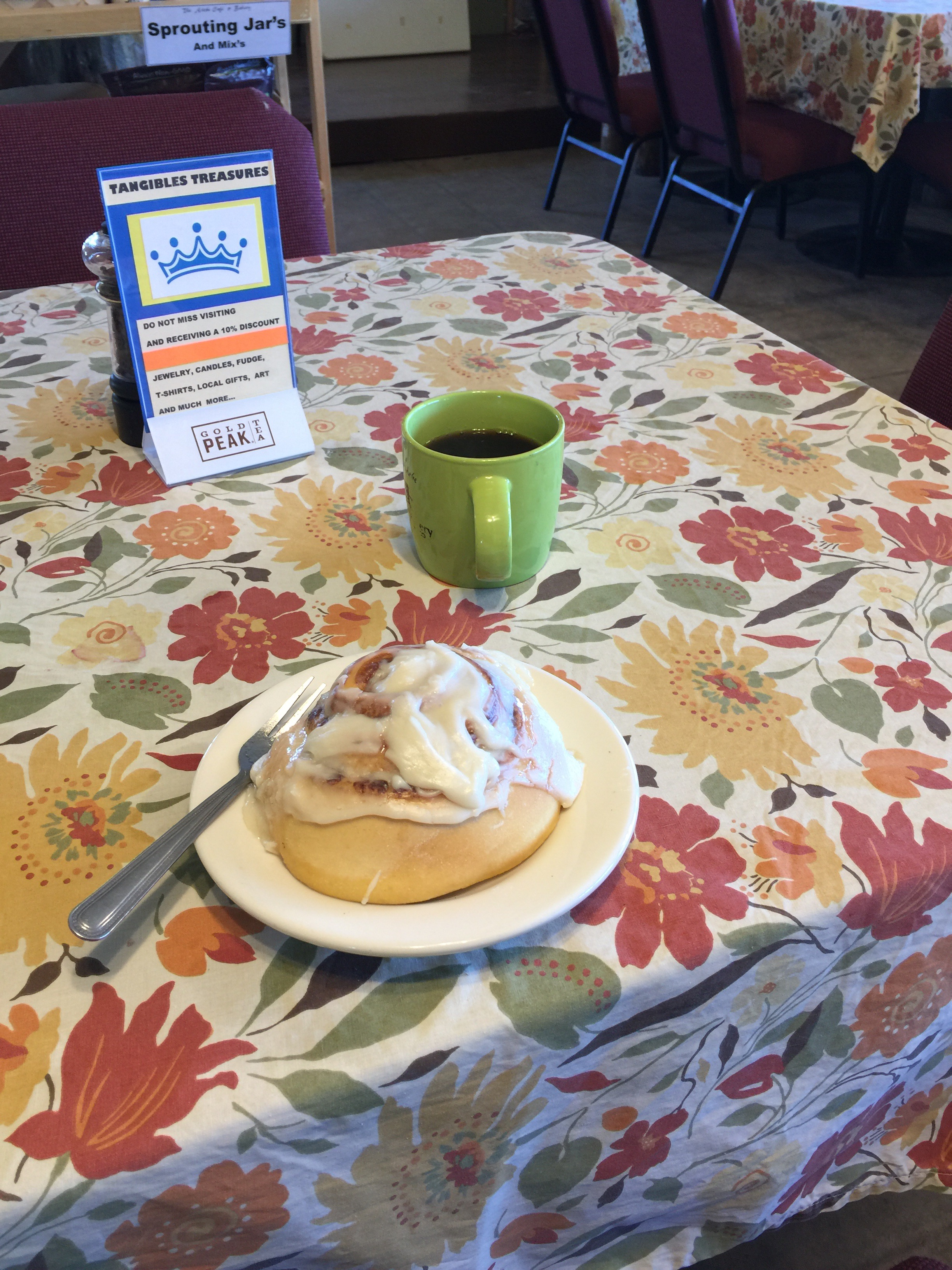 This morning we left the ranch we were staying at near Gila and headed to Santa Fe. A bit down the road we saw a sign for a bakery and coffee shop. We couldn’t resist stopping for coffee and cinnamon roles.