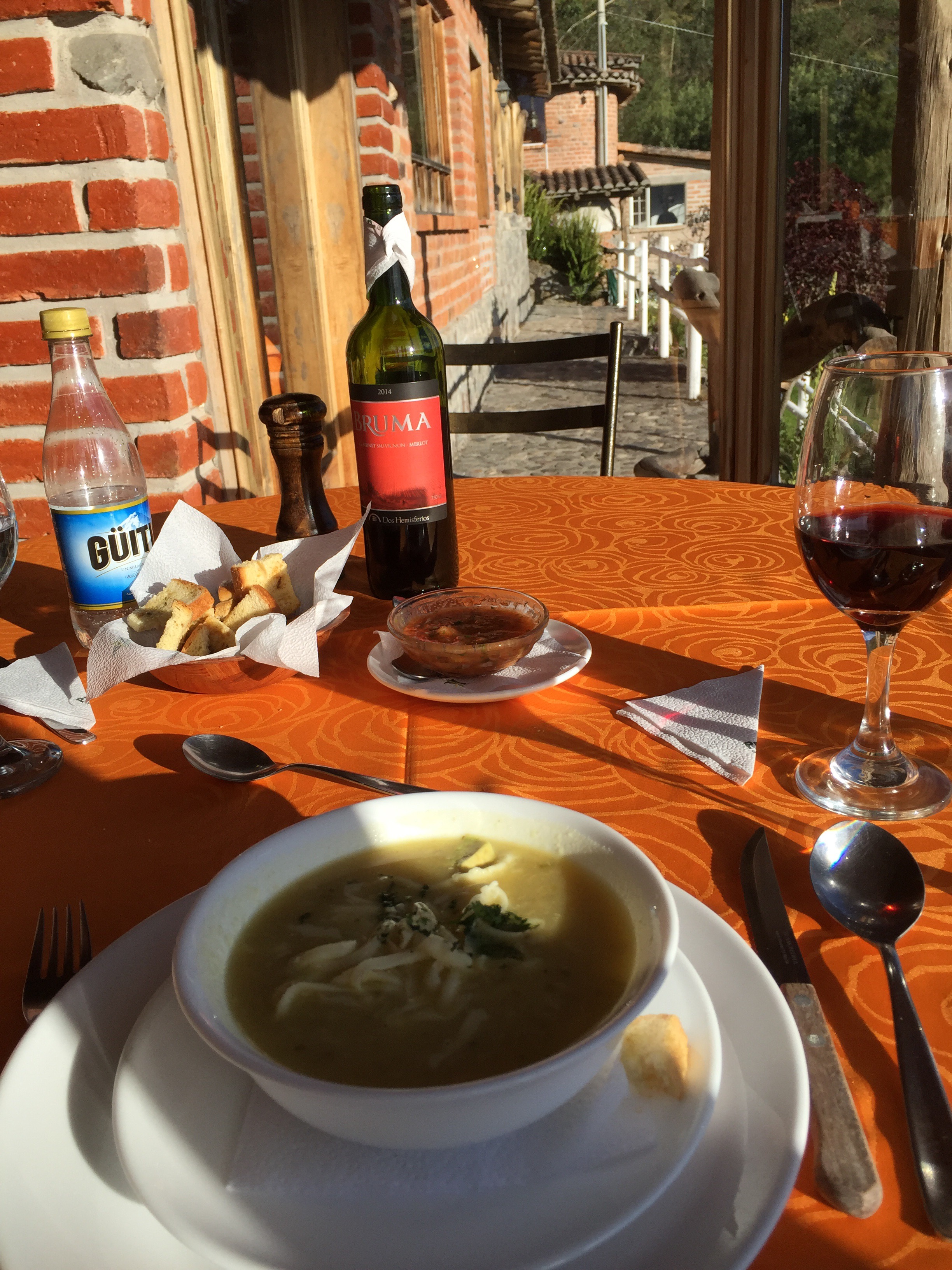 The dining room is in the main building of the hosteria. The food was wonderful. We started with potato soup.