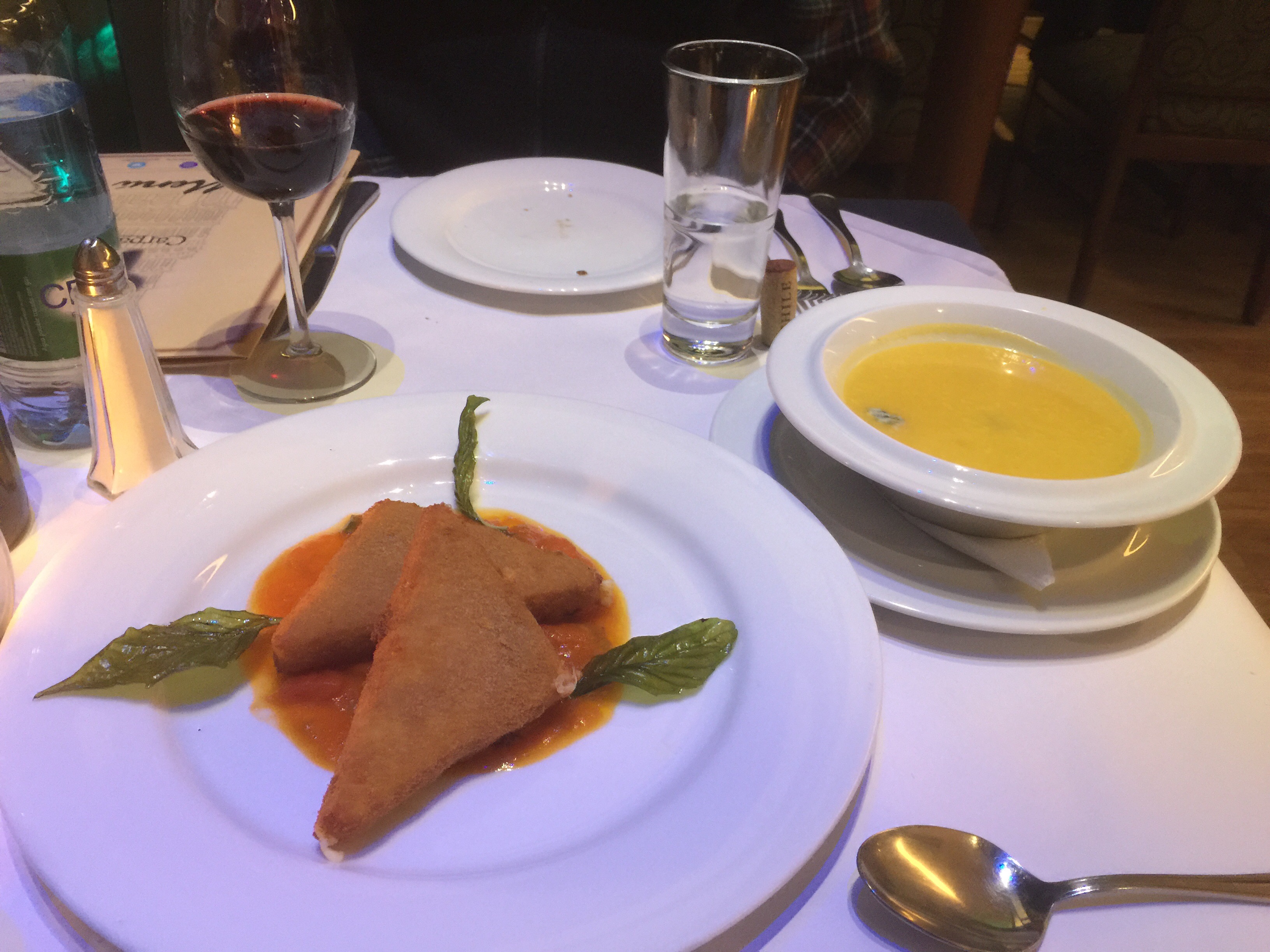 For our last dinner in South America we had a wonderful meal on the top floor of a nearby hotel. The restaurant is called Carpaccio. First we shared a fried mozzarella appetizer then we had squash soup with blue cheese. For the main course we had pasta and for desert chocolate. It was all wonderful.
