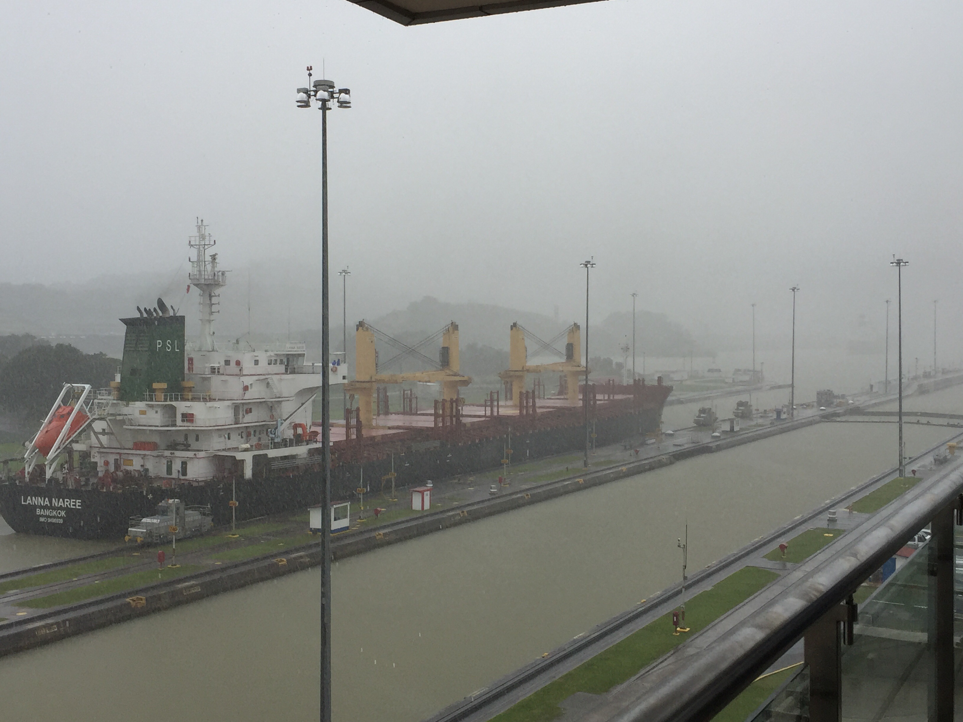Then we arrived at the Canal visitors center. As we walked out on the observation platform a big ship was just entering the Mira Flores lock in front of us. We watched for a long time. Before the ship exited the lock a thunderstorm came in and a there was thunder, lightening and a tropical downpour.