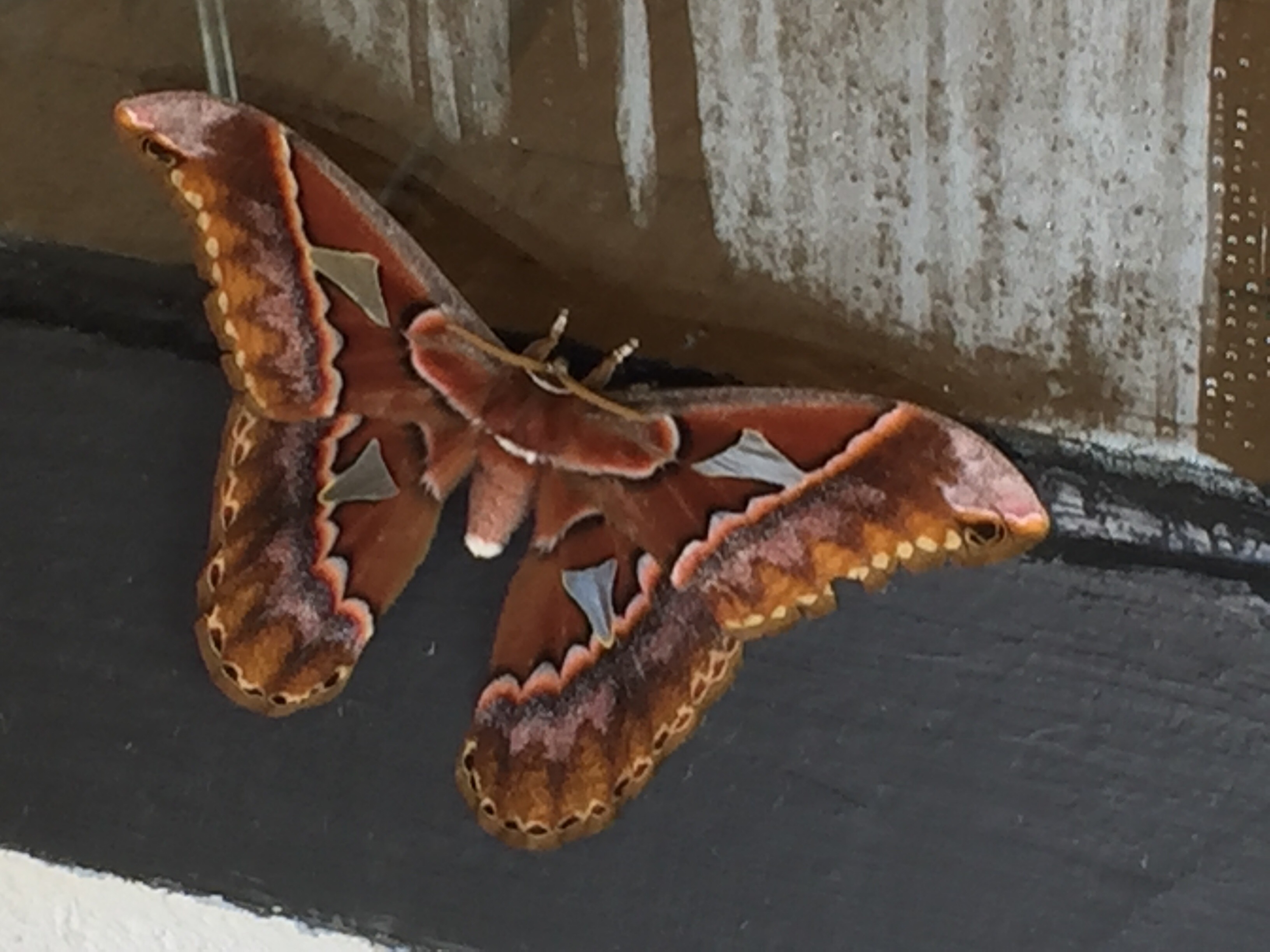This morning a giant moth had died outside our picture window. He was six inches across.