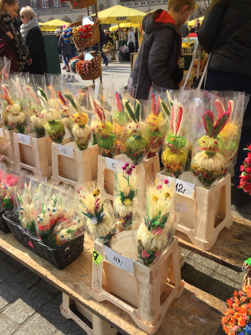 This morning we took the high speed train from Warsaw to Krakow. We arrived around noon. Then we went for a walk through Krakow old town. Today is Palm Sunday so there were a million people out walking. Many were carrying arrangements of grain and flowers.