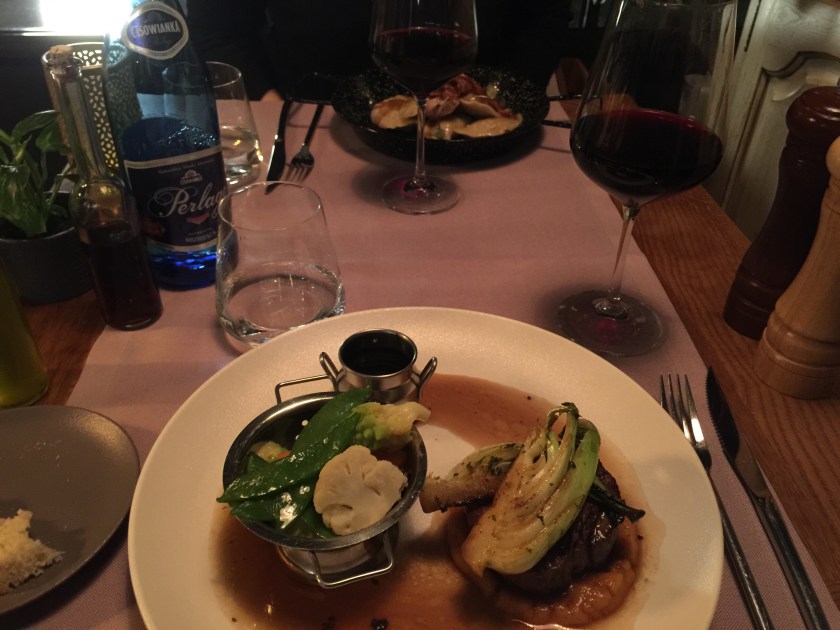 For the main course I had pierogis with a duck meat and chestnut filling. Duke had beef. They were both fabulous.