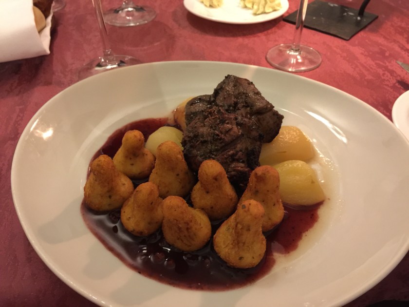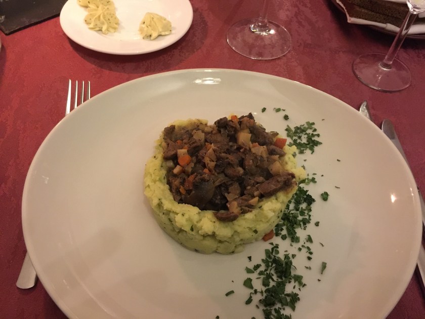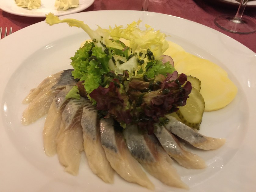 What we have seen of Vilnius is beautiful. We had dinner at Lokys Restaurant. We ate in the basement of the fifteenth century restaurant. We started with herring and a lentils salad.