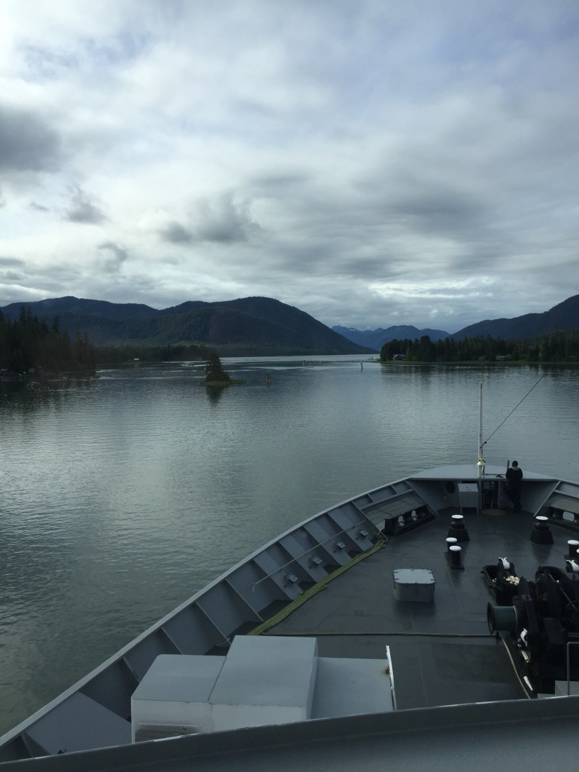 We left Ketchikan on the Alaska Ferry about 9am. Our next stops were Wrangell and Petersburg. We were only in each port for 45 minutes so we didn’t get off. Between Wrangell and Petersburg we went through the Wrangell Narrows. The narrows are narrow! They only have enough water depth to allow the ferry to go through at high tide so the whole schedule is built to plan to be in the narrows then.