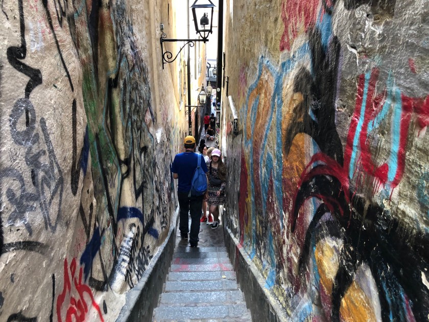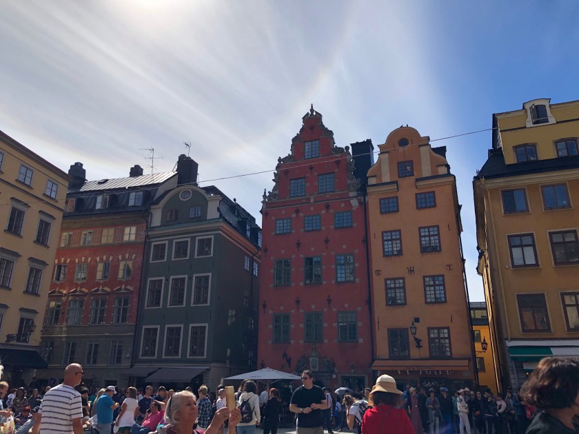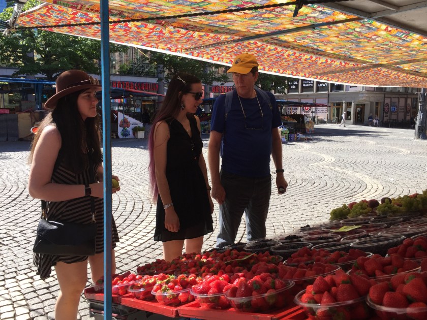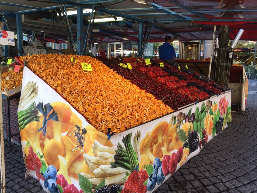 We started out our day in Stockholm buying cherries and blueberries at a fruit stand. The yellow things in the display below are mushrooms.