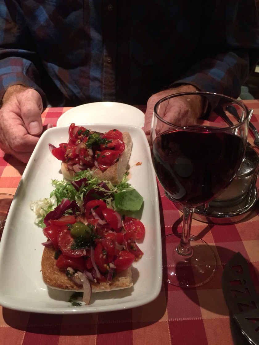 And for a change for dinner we had bruschetta, pizza and wine.
