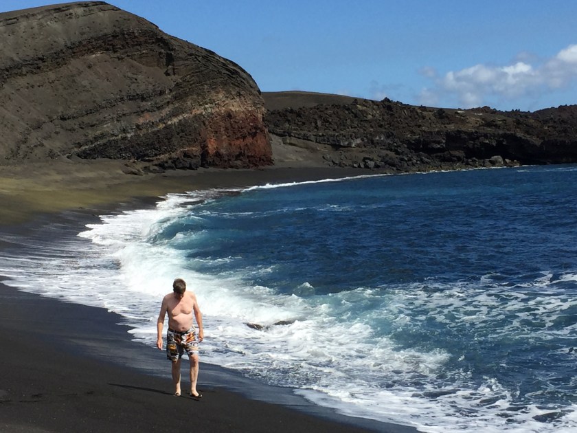 The highlight of the day was our drive down Road to the Sea, a very rough dirt and rock road through a very rugged lava field. The six miles from the highway to the beach took about an hour and the last mile absolutely required four wheel drive. We only saw one other car on the whole road going in. The black sand beach at the end of the road was deserted and exceptionally beautiful. In the green area at the back of the beach there was even some shade and a picnic table. It felt like we were the only people for miles around.