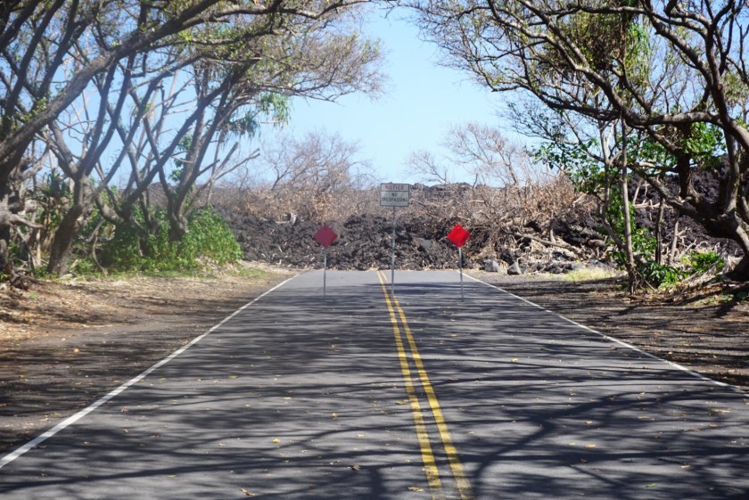 Today we drove to where last year’s Kilauea eruption occurred. The first signs of the eruption were at the summit and at the caldera near where we are staying but the lava actually erupted from fissures on the side of the volcano many miles from here. The lava went into the ocean in several places. They have just recently opened the shore road through the flow. We stopped at a beach park that was almost completely overrun. After that the road was still closed.