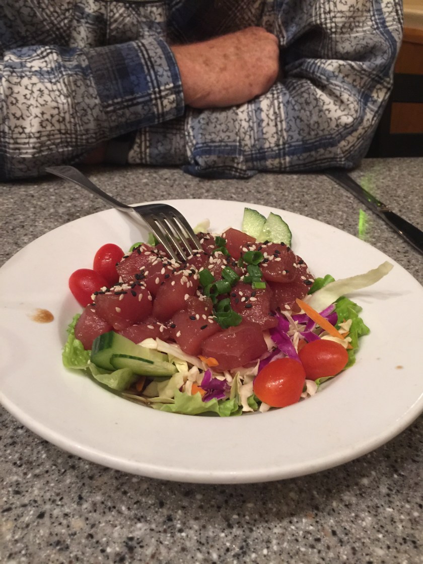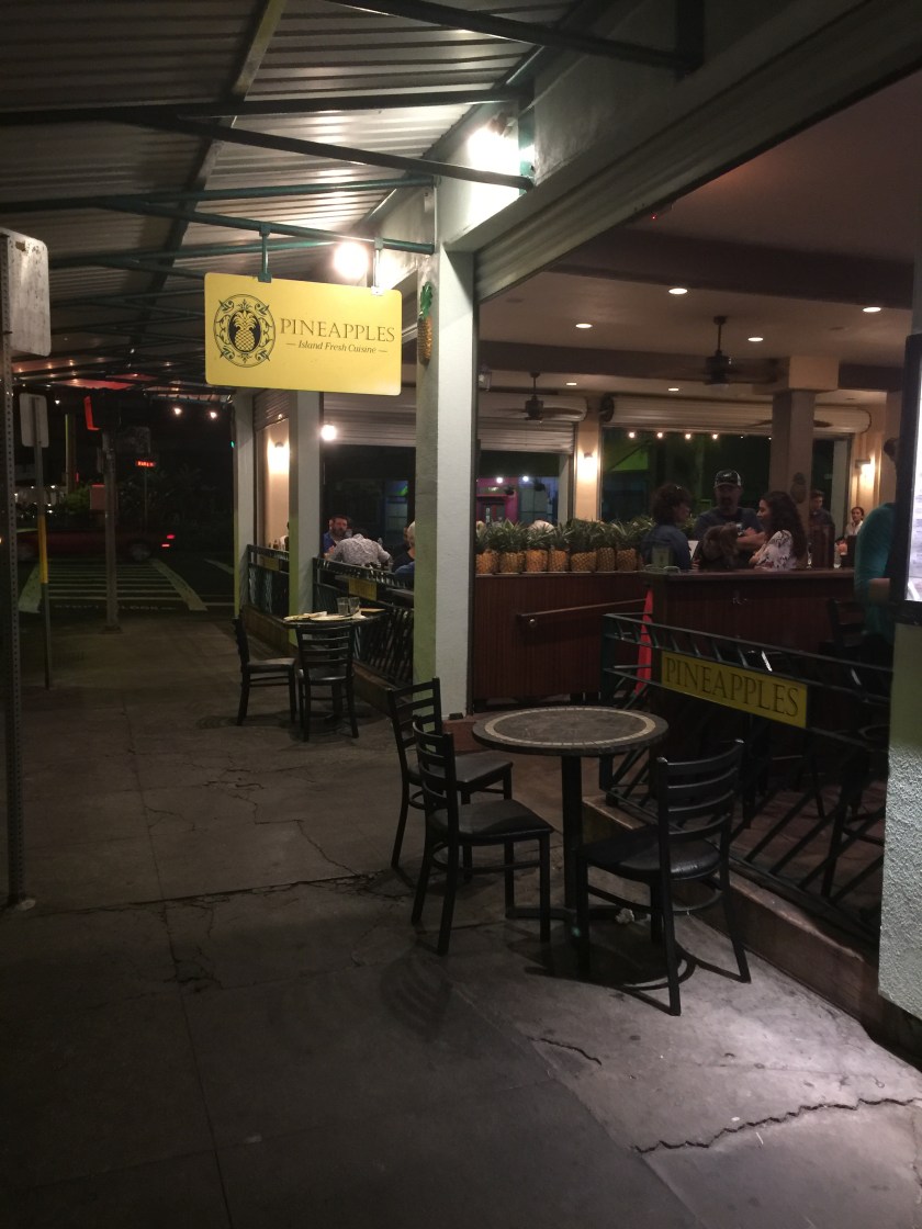 We are staying thirteen miles north of Hilo at Palms Cliff House Inn. Our room has a wonderful ocean view. For dinner we went back into Hilo and ate at Pineapples Restaurant. The setting is open air and very relaxing. We started with some really really wonderful Ahi poke.