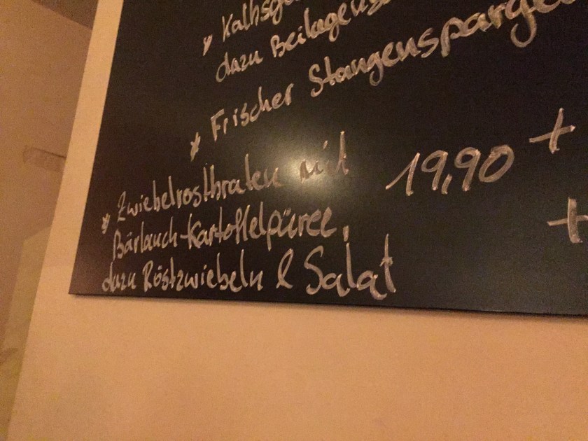 Tonight we had a fabulous German dinner. I had Wiener schnitzel and Duke essentially had steak and potatoes. It was one of the specials. You can see the German description here.