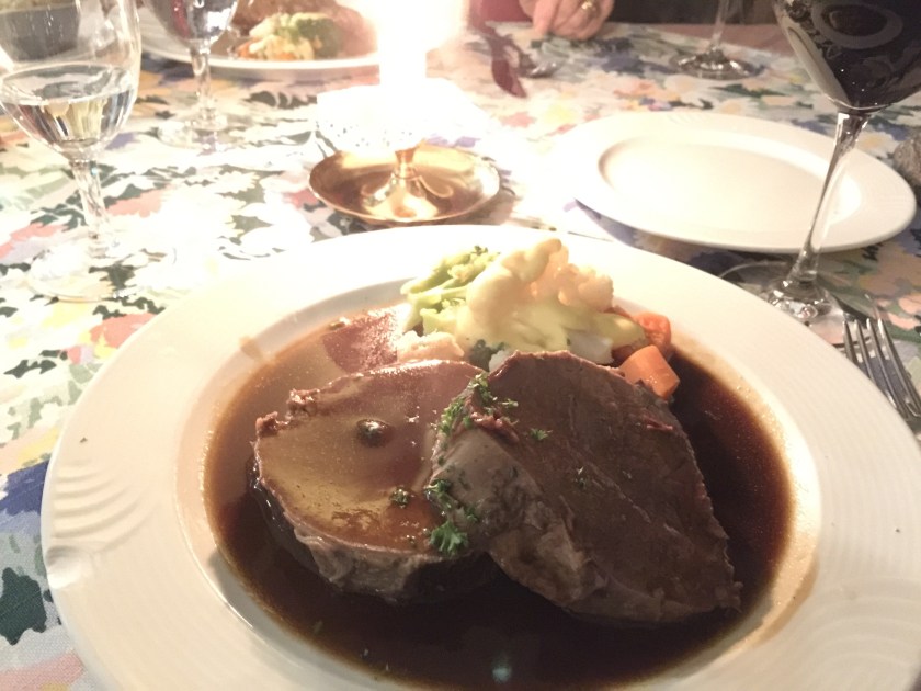Tonight we had a hard time finding a restaurant that was open and still had a table available. After being turned away a few times we lucked out and ate at Zum Rauhen Mann. It was wonderful. I had a steak and Duke had sauerbraten. For desert we had apple fritters.