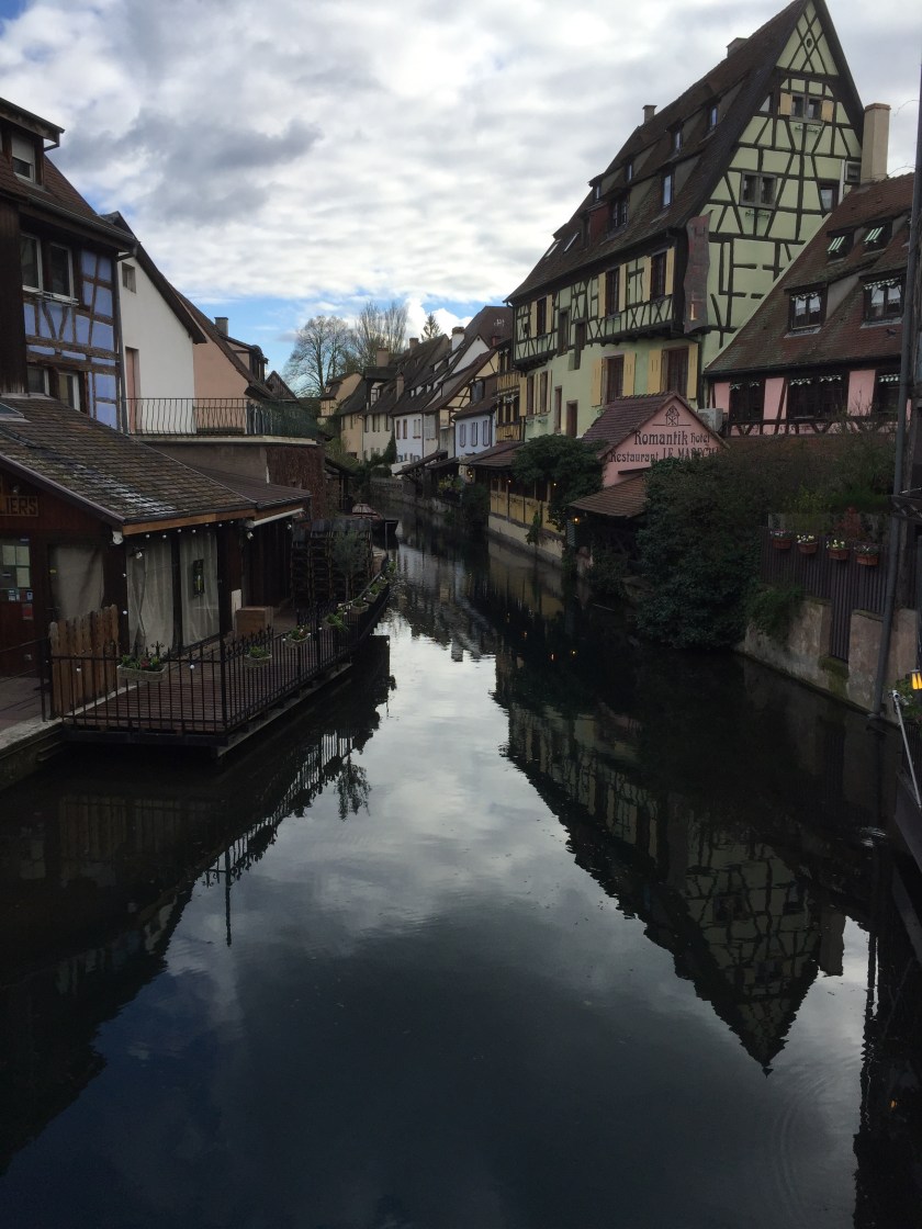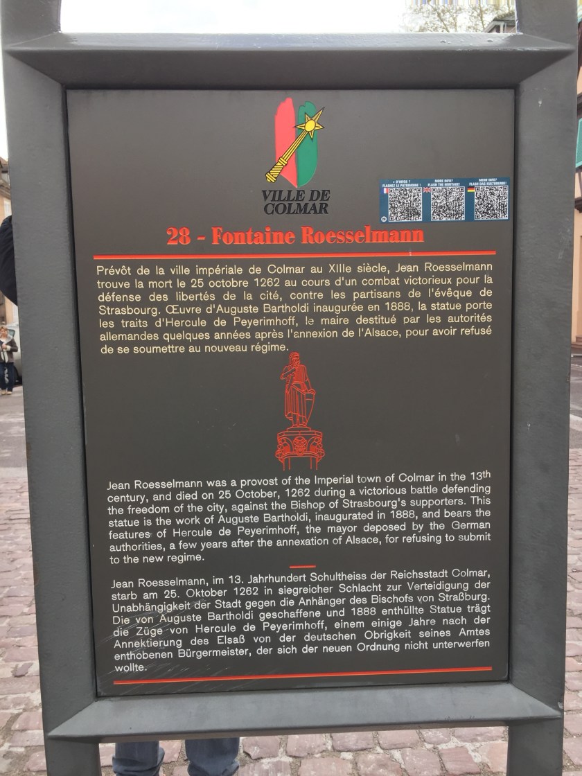 Colmar is in the Alsace region of France. This afternoon we explored. Our host gave us a tourist map and we followed the tourist trail around the old town. Each of forty stopping points on the trail had an informational sign in multiple languages including English. The trail itself was marked with gold triangles set in sidewalk.