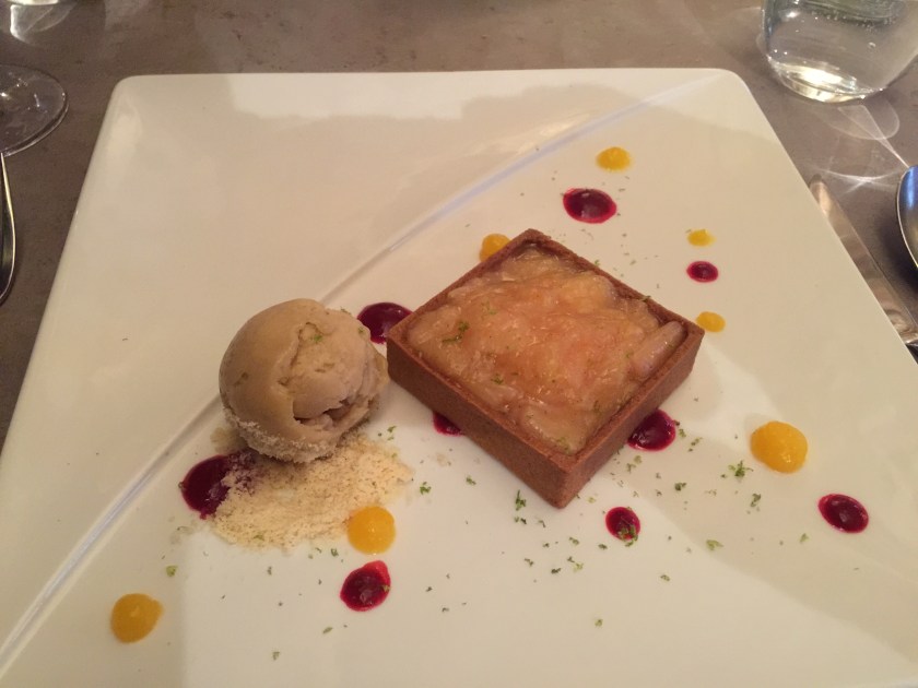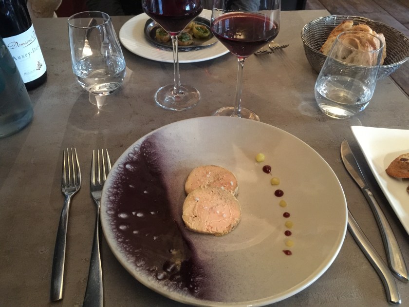 Eventually we went back to our room and put our feet up. We ate dinner at L’Air du Temps. To start I had escargot and Duke had foie gras. The “shells” on my escargot were actually made of pastry and were edible!