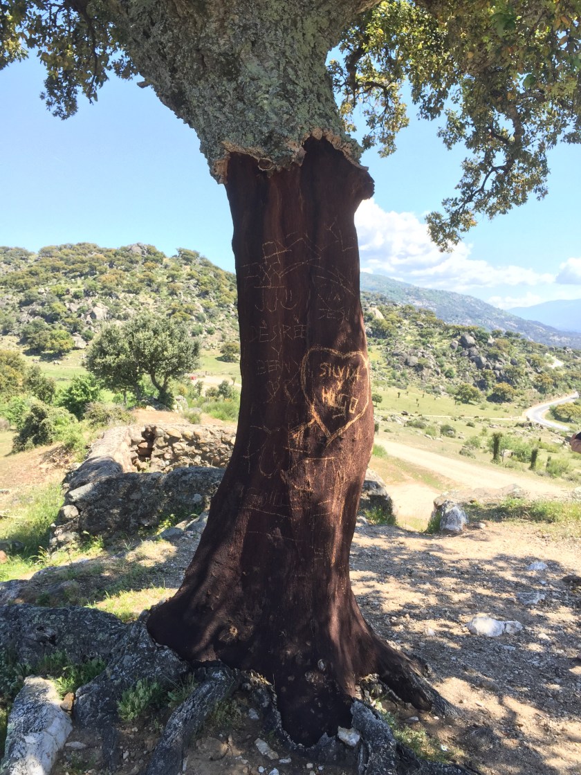 When we left Plasencia Thursday morning our first stop was the lookout Mirador Monte Valcorchero. It gives a panoramic view of Plasencia and all the surrounding countryside and the fields surrounding the lookout are covered with cork trees. In the picture below you can see where the cork bark has been stripped of the lower trunk of the tree.