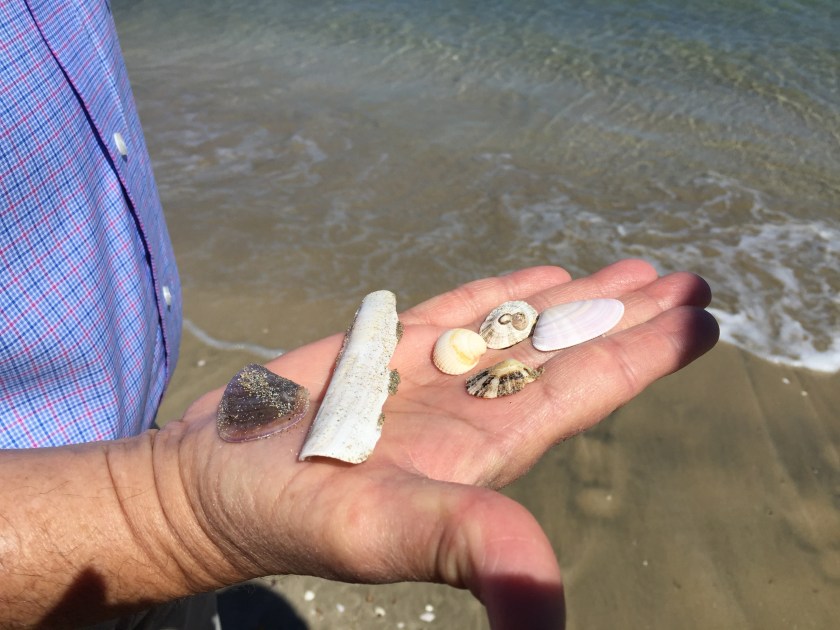 One of the advantages of traveling with a marine biologist is that he can identify all the shells you find. From left to right – mussel, razor clam, cockle, limpet, limpet with a barnacle on it and a Venus clam.