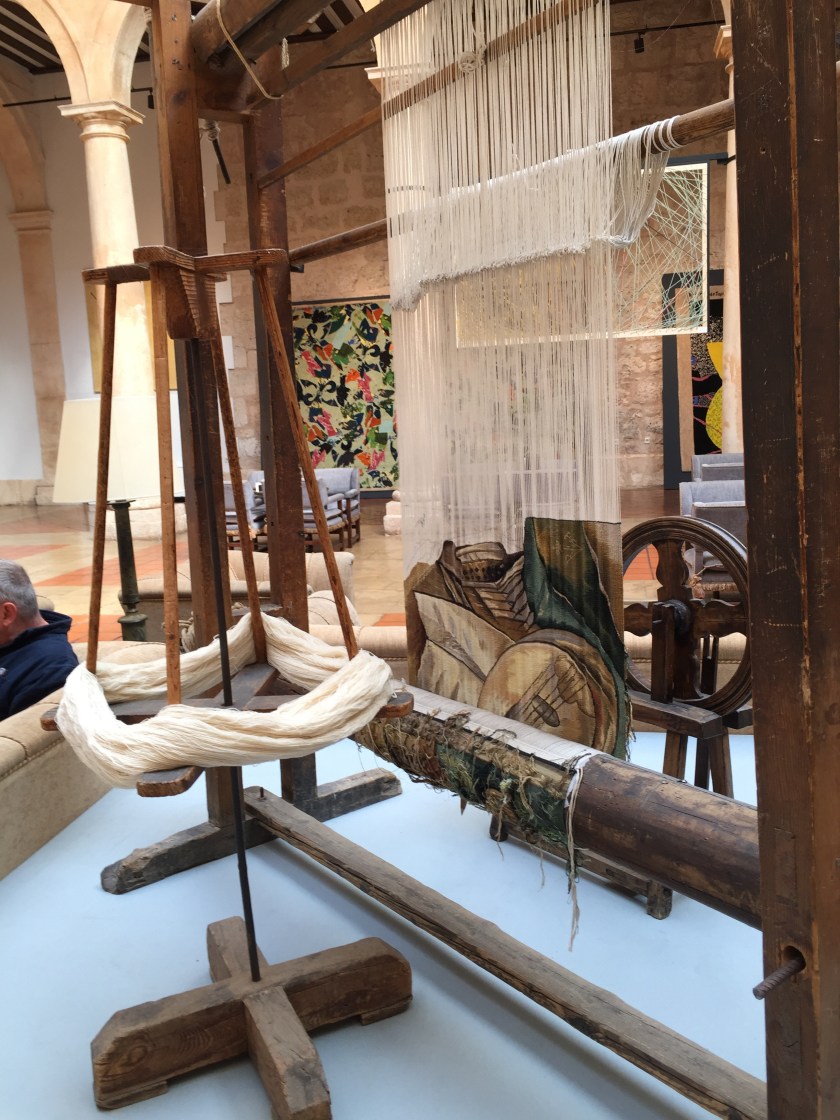 In the center of the lounge is a big loom with a partly finished tapestry on it. On one side you can see the thirty or so spindles with different colored thread being worked. On the other side the rich picture is emerging.