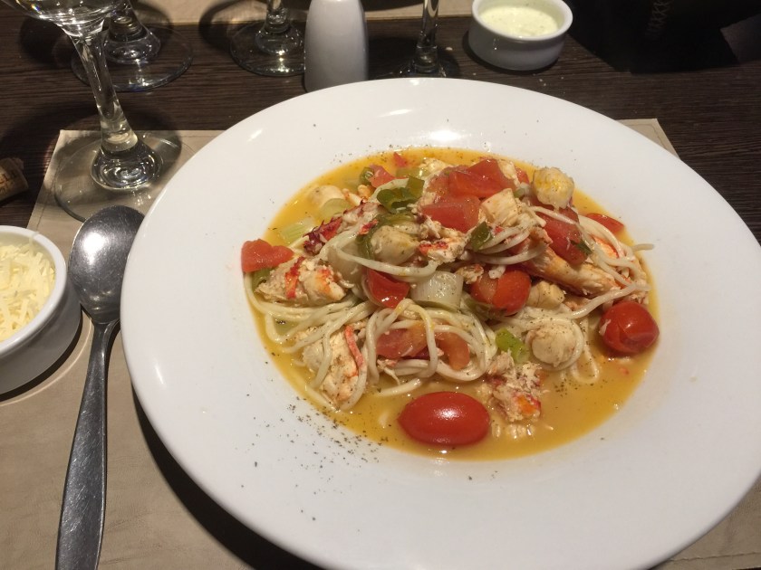 At six we got on the Ventus Australis. We have a wonderful room with a big 5 ft by 5 ft window. We had dinner on the ship and went to sleep watching the spectacular snow capped mountains slide by our window.