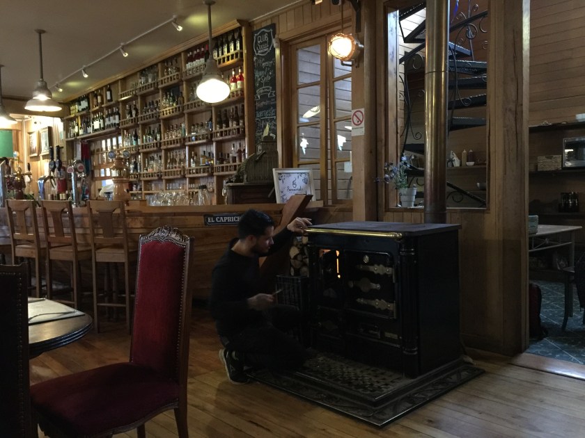 The atmosphere was great too. The wood stove in the picture below warmed us and there were children playing with toys in a play area in the back. The building originally was the Ancud social club.