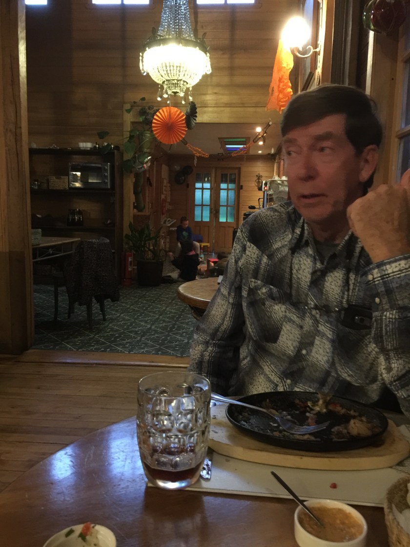 Our hotel is in Ancud, a town on the north end of the island. We took it easy for the rest of the afternoon and ate dinner near the center of town at a fabulous place called Club Social Baquedano. We had locally made beer with our seafood. Duke had squid and I had fish with four different sauces. It was a total surprise when mine arrived and it had 15 fish fillets. We couldn’t finish them all but oh my were they good! The platter wouldn’t fit on the table so they brought a stool to set it on.