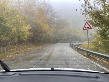 The autostrada toll roads that we have driven on in Italy have been excellent roads. The exits are usually many miles apart. Wednesday we mainly drove on the autostrada since the route was about the same as if we had driven the non toll roads and the driving time was about an hour less. So when we started out, instead of going back about five miles to the autostrada entrance, we drove the mountain roads about 25 miles to get to the next entrance. As the days have gone by and we have gotten farther north the leaf colors have gotten better and better. It rained almost all day but especially in the mountains it was a beautiful drive.