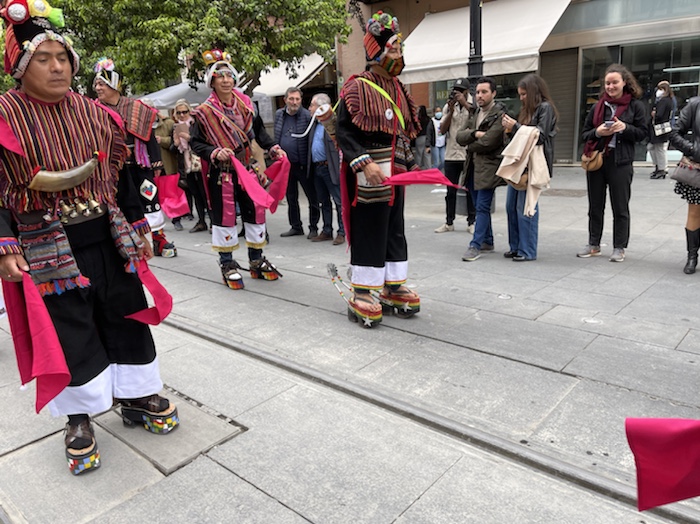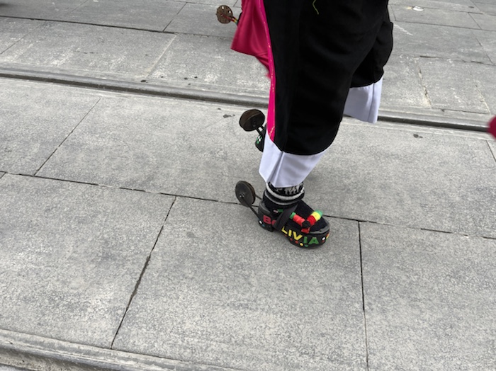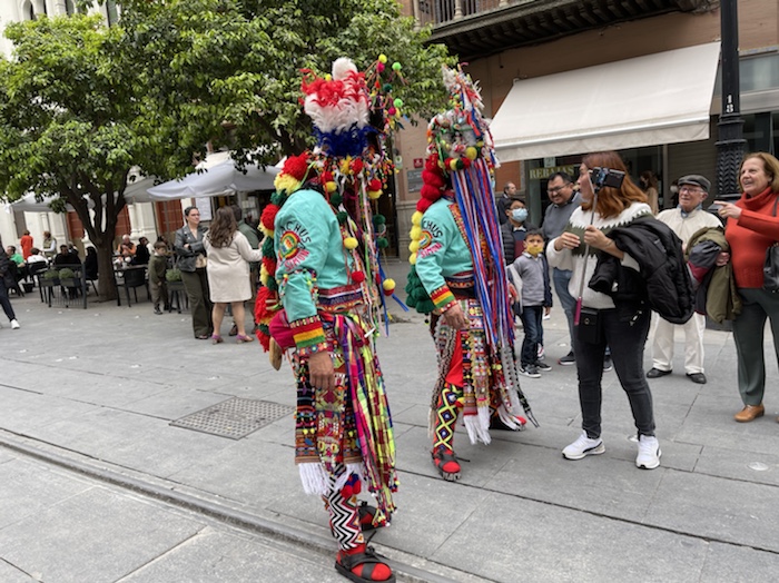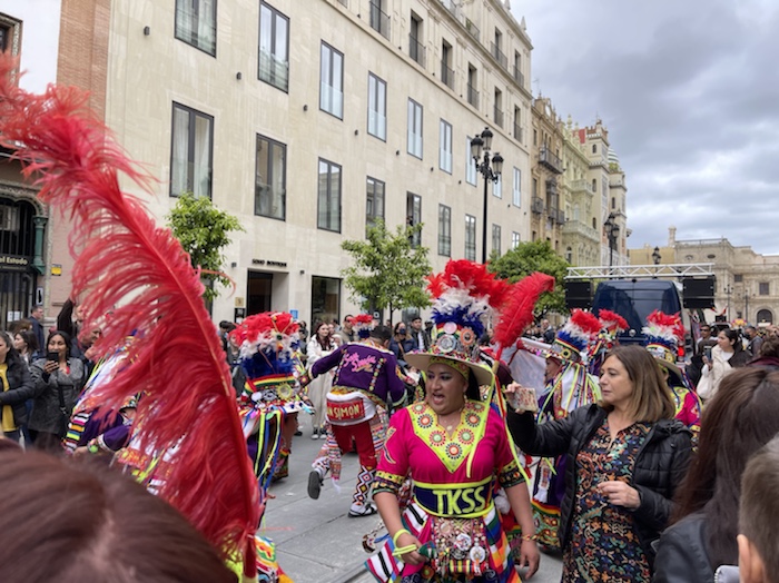 After playing cards for a while by the hotel pool, we decided to take a walk through the newer shopping district of Sevilla. When we got over to Avenida de la Constitución, just past the cathedral we discovered a big parade of mainly Peruvian and Bolivian dancers. they wore wonderful, colorful costumes. The dancing was fast, exuberant and lots of fun to watch.