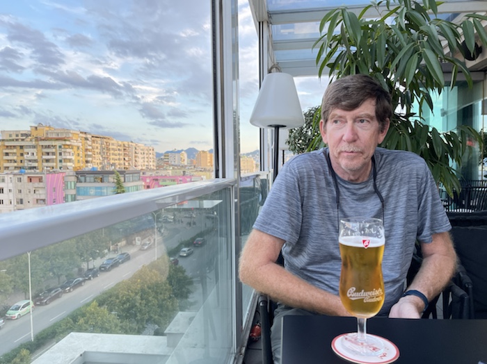 About 4:30 we arrived in Tirana and walked to our hotel. After changing some money we went up to the roof top bar for a drink and a snack.