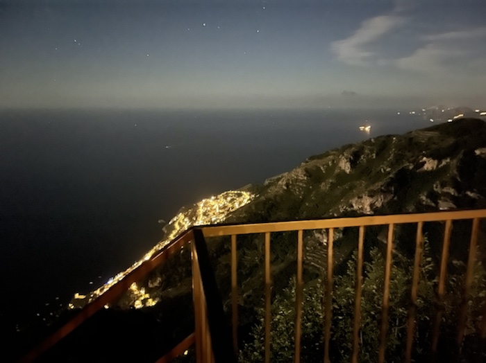 After dinner we walked back up to our hotel. Look at the view from the terrace! By the way, the weather was lovely today. It was raining and warm when we left Naples, but on the Amalfi Coast the temperature is about 80 and there is a cool breeze. Perfect!