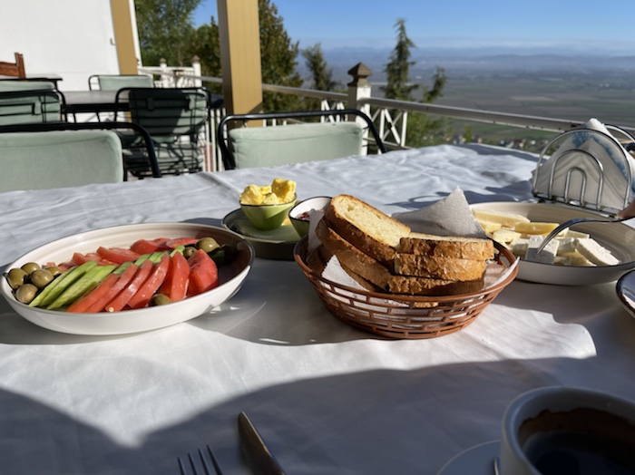 We had a great breakfast at Hotel Ardenica this morning. We had really good hot coffee, tasty fresh tomatoes and cucumbers, hot scrambled eggs, local cheese, and good toasted bread. And we were sitting in the open air with a great view and the sun at our backs.