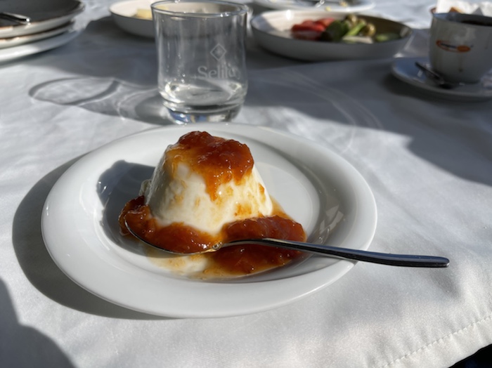 After we finished we were working on the New York Times crossword enjoying the view and the sun when Olsi the manager brought us a home made desert. It was delicious.