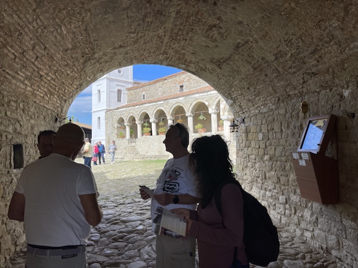 At six we joined a winery tour and wine tasting. There were ten of us. We saw where the family grows and produces their wines. then we all sat at a big table and started tasting wine and talking. One couple was from Switzerland another was from Holland and a group of four were from the Czech Republic. When our host said the oldest person had to propose the toast before we downed our house made raki I was quick to point to Duke. He proposed a toast to Albania and Albanian food. Our host joined in with a big smile.