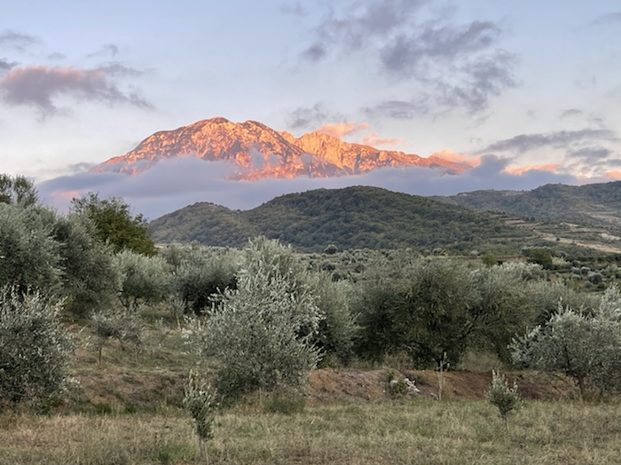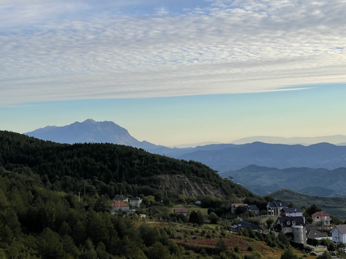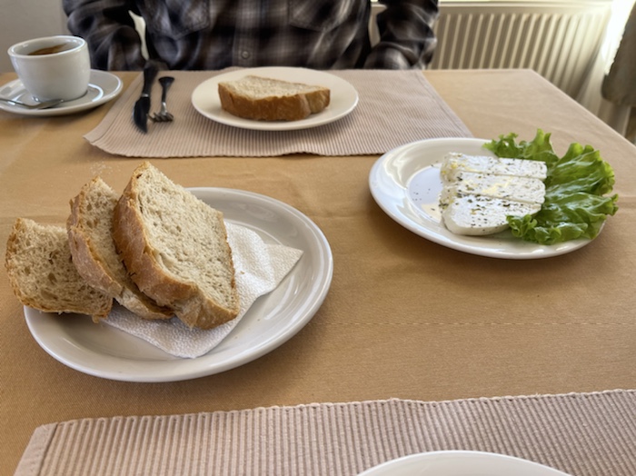 Tonight we are at a guest house with a stunning view to the west. This morning there was no coffee at breakfast so the first thing we did when we arrived at Sofra E Shpatit, where we are now, was have a snack of coffee, bread and cheese.