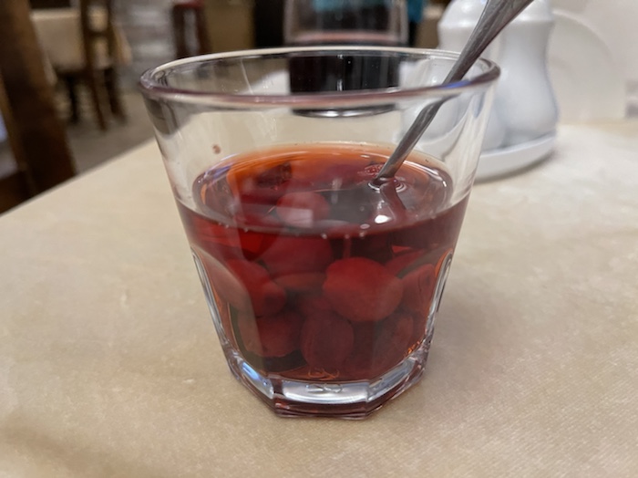 We had dinner at the hotel. We ended with a homemade compote of cornos berries. I’d never heard of cornos berries before, but they were a bit like cranberries with a pit.