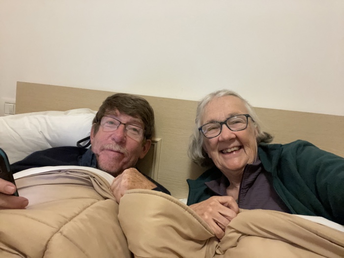 There is no heat in the rooms and I’m guessing the temperature is around 55 or 60 so we are bundled up working on our phones!