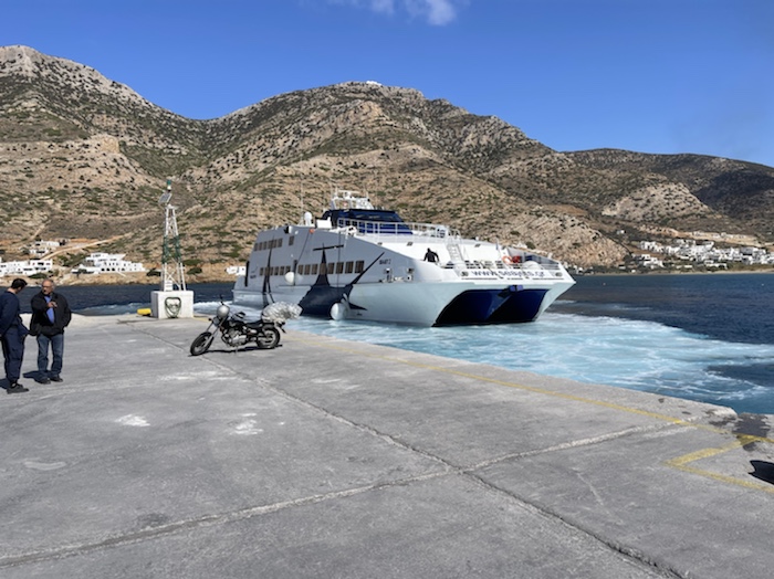 The ferry that we took to the island of Sifnos was a high speed ferry. We didn’t think it would be a rough ride but is was certainly rougher than expected. It was a three hour ride with one stop. The seats were 14 across and it was almost full. We were supposed to stay seated. They were passing out seasick bags but luckily both of us survived. It was not a fun ride.